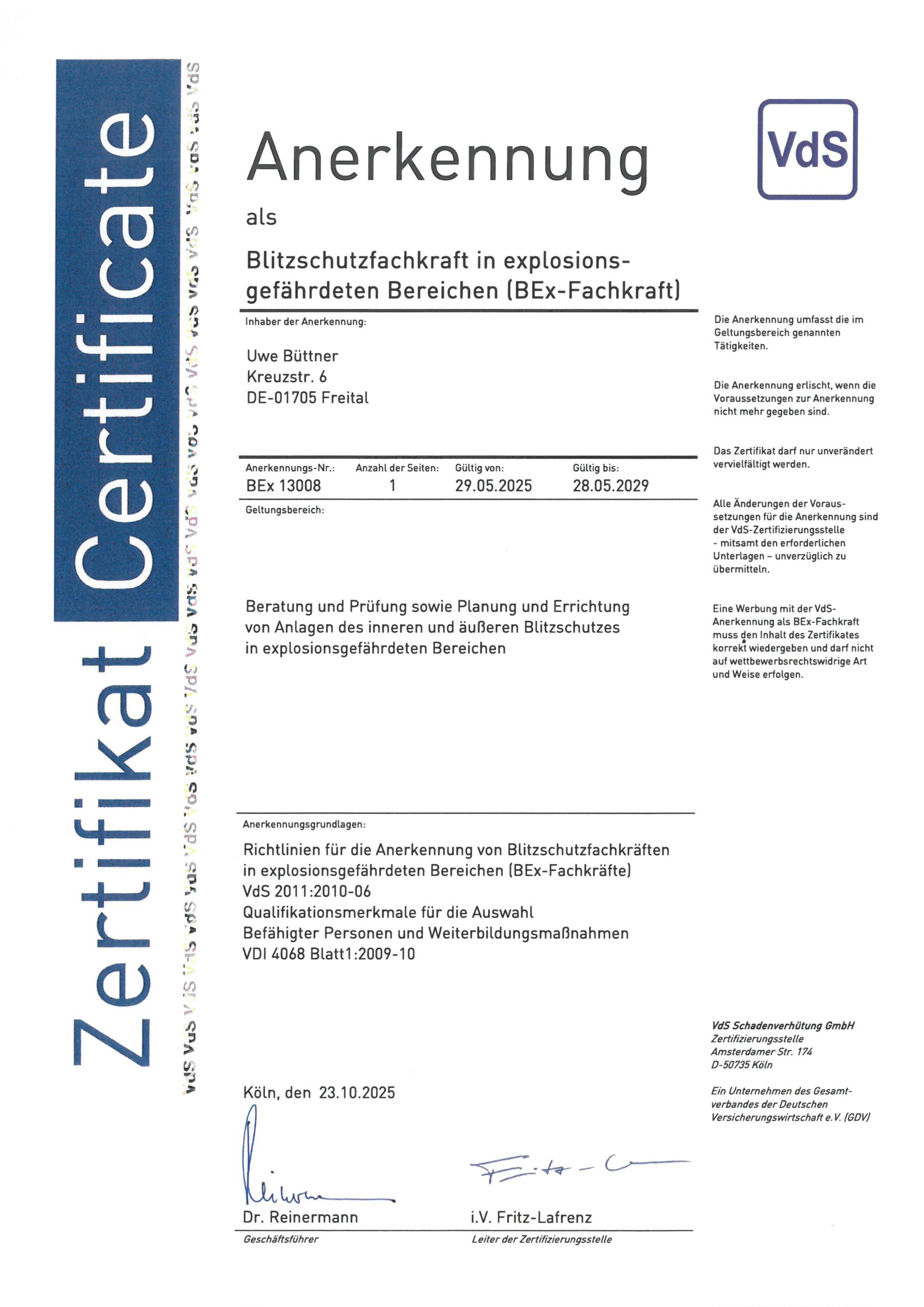 1991 absolvierte Herr Büttner die Ausbildung zum Blitzableitersetzer. Gleichzeitig wurde das Gewerk Blitzschutz mit in das Leistungsangebot unserer Firma aufgenommen. Zunehmend wurde dieses Gewerk zum Hauptertragszweig ausgebaut. Von 1996 bis 2013 firmierte die Firma als Uwe Büttner und Peter Gawrisch GbR. Im Jahre 2013 erfolgte die Umfirmierung zur BlitzAS GmbH. In der neuen Firma wurden die beiden Schwerpunkte Blitzschutzanlagen und Industrieklettern noch besser zusammengeführt.